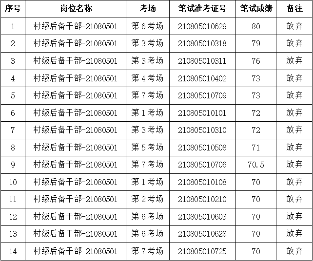 根據《長豐縣朱巷鎮2021年公開招考村級后備干部公告》(2021-07-23)的規定,資格復審已于2021年9月16日結束,因個人原因自動放棄資格復審,其放棄人員如下: