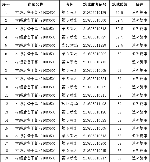 根據《公告》規定,所空名額按筆試成績從高分到低分依次等額遞補一次(最后一名如有多名考生筆試成績相同的,同分人員均進入下一環節)。故遞補復審人員如下: