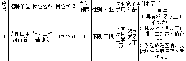 因工作需要,經研究同意,委托遠創人力資源管理集團有限公司,公開招聘廬陽區四里河街道社區工作輔助崗人員1名。現就有關事項公告如下: