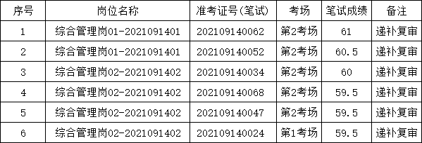 根據《公告》規定,所空名額按筆試成績從高分到低分依次等額遞補一次(最后一名如有多名考生筆試成績相同的,同分人員均進入下一環節)。故遞補復審人員如下: