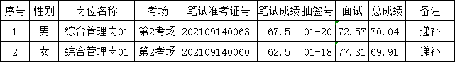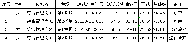 根據《肥東縣張集鄉2021年公開招考村級后備干部公告》(2021-09-14)相關要求,經過現場報名、資格審核、筆試、面試、體檢等程序,由于以下2名考生體檢放棄。遞補2名考生體檢放棄。