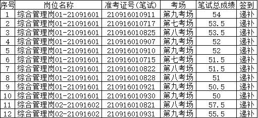 根據(jù)《公告》規(guī)定,所空名額按筆試成績從高分到低分依次等額遞補(bǔ)一次(最后一名如有多名考生筆試成績相同的,同分人員均進(jìn)入下一環(huán)節(jié);筆試成績低于50分的考生不得進(jìn)入下一環(huán)節(jié))。故遞補(bǔ)復(fù)審人員如下: