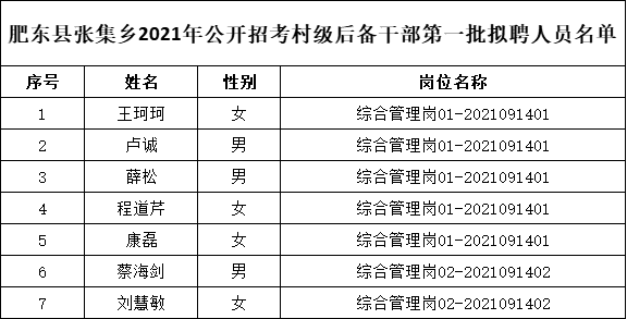 根據《肥東縣張集鄉2021年公開招考村級后備干部公告》(2021-09-14)的招考要求,經過網上報名、資格審核、筆試、面試、體檢政審等程序,現將擬聘人員名單公示如下: