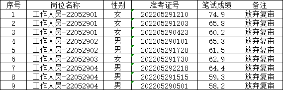 根據《肥西縣花崗鎮2022年公開招考村級后備干部公告》(2022-05-28)的招考要求,資格復審已于2022年6月16日16:00結束,以下9名考生因個人原因自動放棄資格復審,其放棄人員如下: