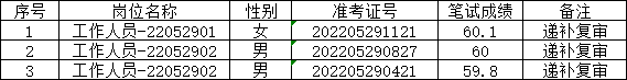根據《公告》規定,所空名額按筆試成績從高分到低分依次等額遞補一次。若出現筆試成績并列,同分人員均進入遞補復審環節。故遞補人員如下: