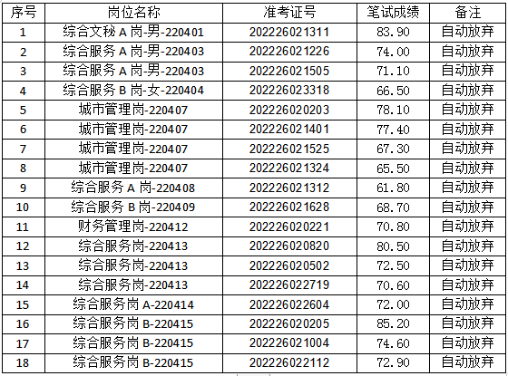 根據(jù)《合肥市蜀山區(qū)2022年政府購買服務(wù)崗位招聘公告》(2022-04-02)的規(guī)定,資格復(fù)審已結(jié)束,因個人原因自動放棄、資格復(fù)審不合格或未在規(guī)定時間、地點參加資格復(fù)審的,其放棄人員如下: