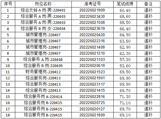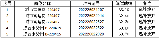 根據(jù)《公告》規(guī)定,所空名額按筆試成績從高分到低分依次等額遞補(若出現(xiàn)筆試成績并列,同時入圍資格復(fù)審人員名單),因以下考生遞補放棄