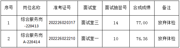 根據《合肥市蜀山區2022年政府購買服務崗位招聘公告》(2022-04-02)的規定,經過報名、資格初審、筆試、資格審核、面試、體檢等程序,由于以下2名考生體檢放棄