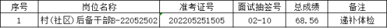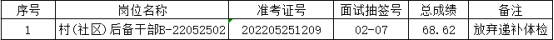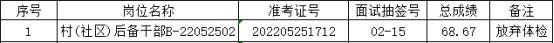 根據(jù)《長(zhǎng)豐縣下塘鎮(zhèn)2022年公開選拔村(社區(qū))后備干部公告》(2022-05-18)的規(guī)定,經(jīng)過(guò)報(bào)名、資格初審、筆試、資格審核、面試、體檢等程序,由于以下1名考生放棄體檢。