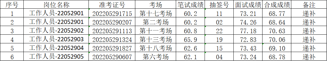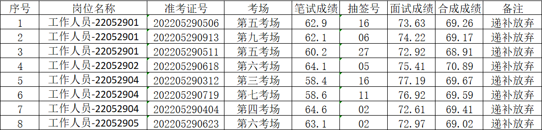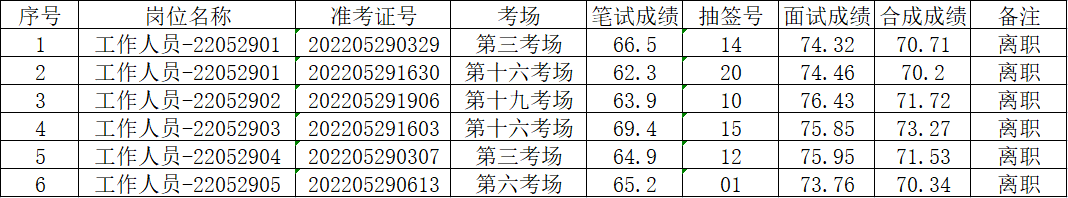 根據(jù)《肥西縣花崗鎮(zhèn)2022年公開招考村級后備干部公告》(2022-05-28)的規(guī)定,經(jīng)過網(wǎng)上報名、資格初審、筆試、資格復(fù)審、面試、體檢等程序,由于以下6名考生自動離職: