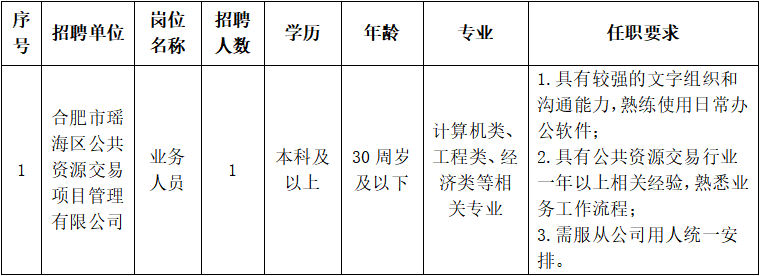 因工作需要,合肥市瑤海區公共資源交易項目管理有限公司計劃面向社會公開招聘業務人員1名,現就有關事項公告如下:
