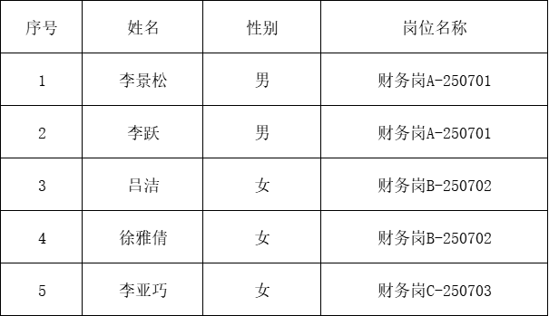 根據《合肥新亞新興能源有限公司招聘5名財務人員》(2025-07-23)公告規定,經過網上報名、資格審查、筆試、面試、體檢政審等程序,現將擬聘人員名單公示如下: