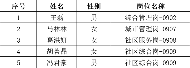 根據(jù)《蜀山區(qū)2025年社區(qū)工作者招聘公告》(2025-09-24)的規(guī)定,經(jīng)過網(wǎng)上報名、資格初審、筆試、資格復(fù)審、面試、體檢和考察,現(xiàn)將擬聘人員名單公示如下: